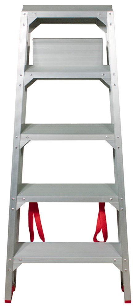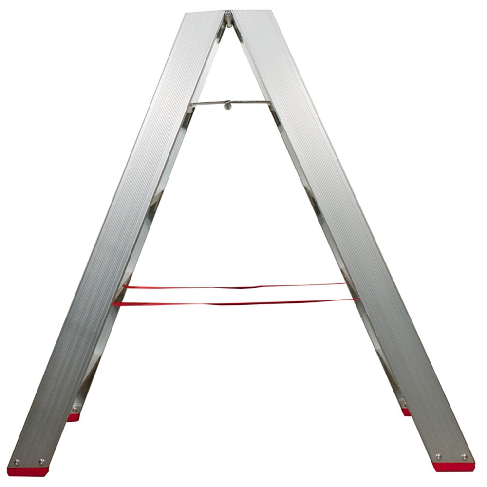 Oerdegelijke industrietrap met 4 schetsplaten en 12(!) popnagels in iedere trede. Het geanodiseerd aluminium is vuilafstotend en geeft niet af (geen vuile handen). De 10 cm diepe treden en het grote bordes zorgen voor een comfortabele werkplek. Bij de dubbel oploopbare trap is er een tweede stabordes dat als spreidbeveiliging fungeert. Vanaf 2x3 treden compleet geleverd inclusief verplichte steunbeugel (ARBO).