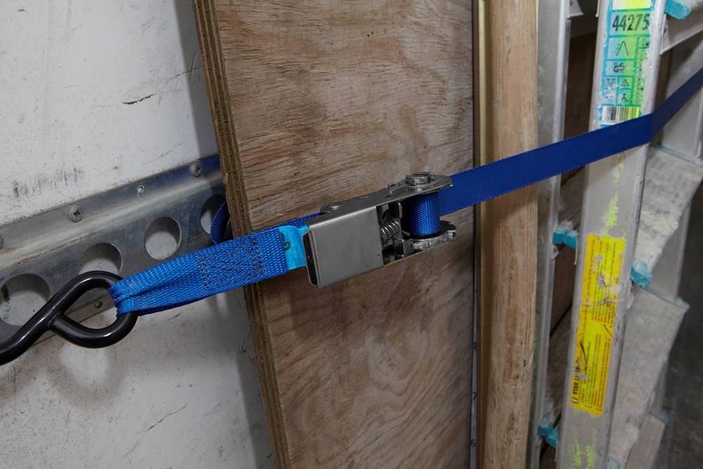 Sjorband 25mm. ratel blauw 5.0m met S-haken zwart