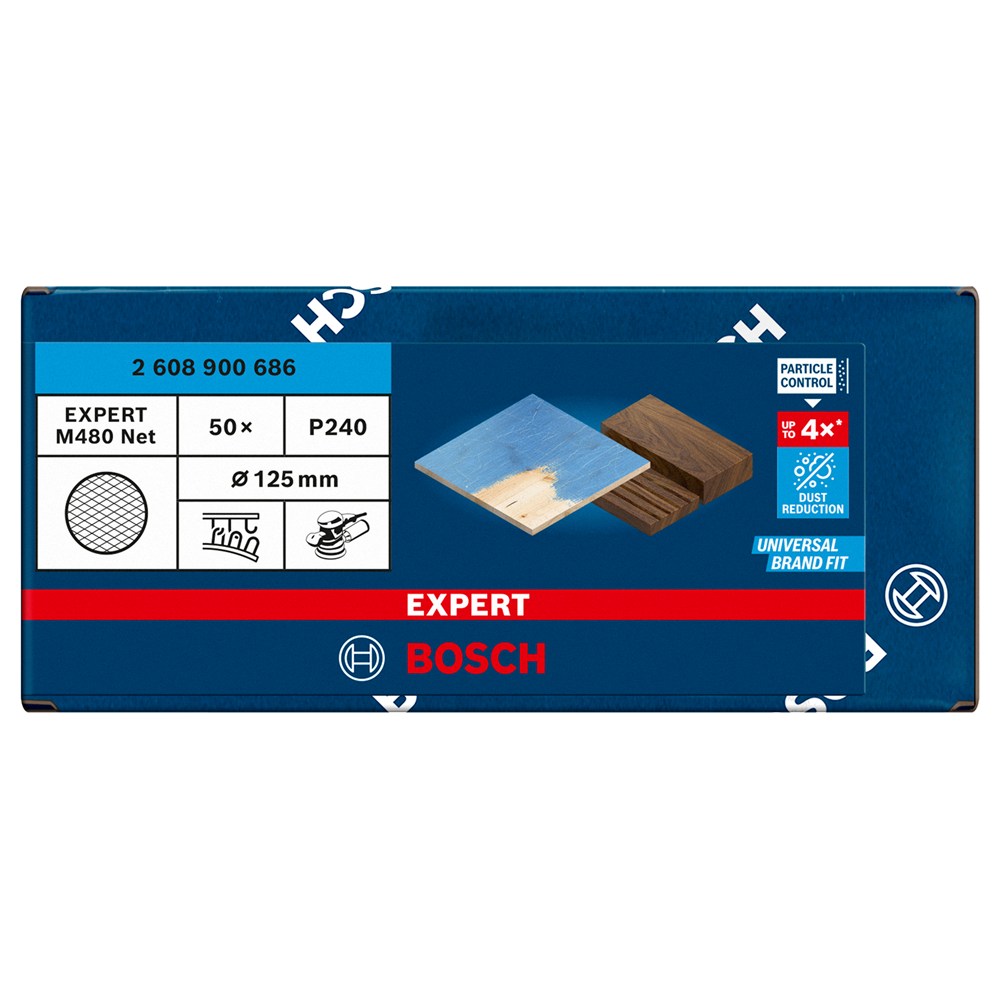 Stof is het grote nadeel bij schuren. Het verstopt je schuurpapier en maakt het ineffectief. Het bedekt de hele kamer en alles in je huis. Daarom hebben wij Bosch Particle Control technologie ontwikkeld waarmee stofreductie naar een hoger niveau wordt getild. Minder stof tijdens het schuren is niet makkelijk, maar wij hebben een oplossing gevonden. Dit Bosch EXPERT M480 schuurnet gebruikt onze Particle Control technologie om het stofniveau tot een minimum te beperken.
