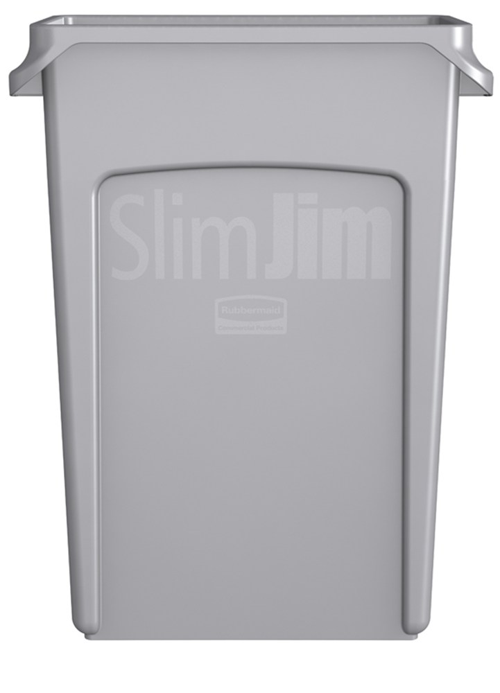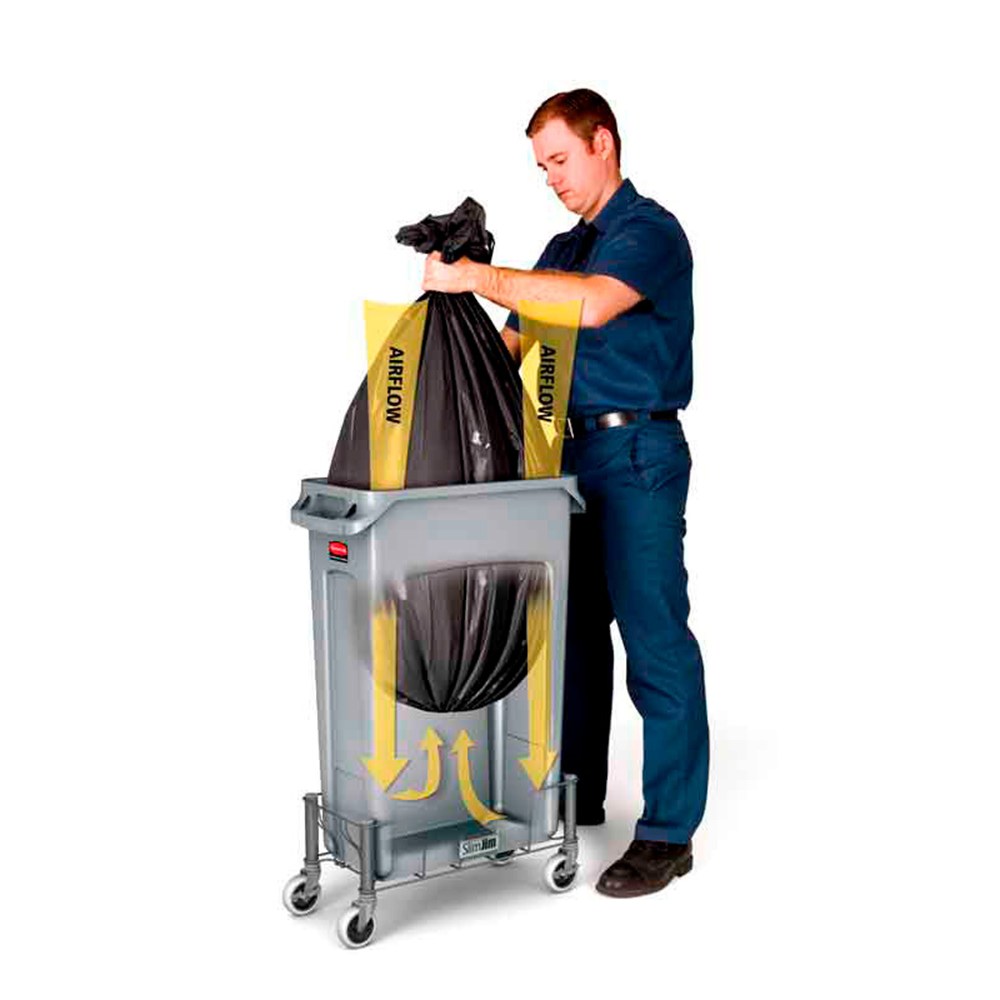 Kunststof Slim Jim container met luchtsleuven waardoor minder trekkracht nodig is om de afvalzak te verwijderen. Vier doortrekopeningen en treksluitingen maken vastbinden overbodig. Vaste gegoten grepen maken heffen en legen eenvoudiger.