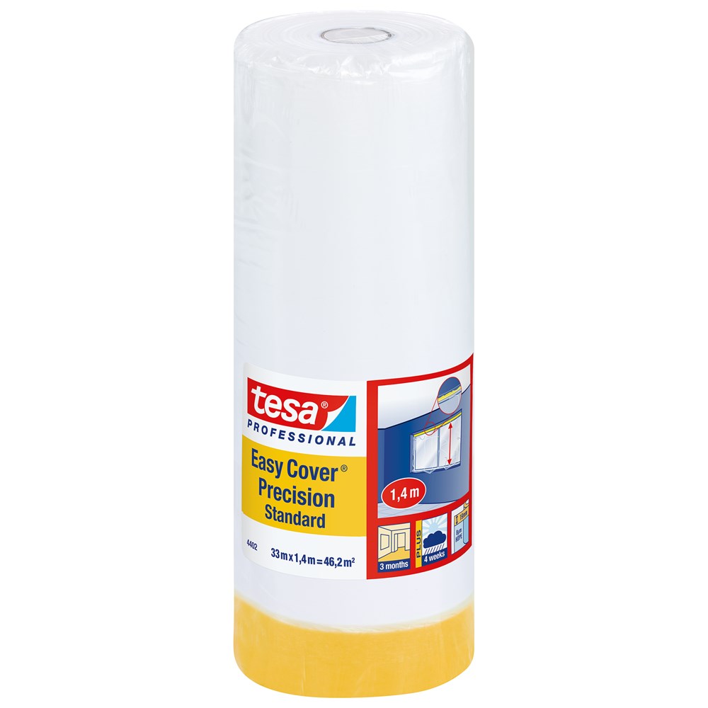 tesa Easy Cover® Precision Standard combineert afdekfolie en schilderstape, waardoor u grote oppervlakken in slechts één stap kunt afdekken en nauwkeurig afplakken. Professionele schilders kunnen met deze slimme 2-in-1 oplossing heel wat tijd besparen, omdat ze veel sneller aan het verfwerk zelf kunnen beginnen. tesa Easy Cover® kan gemakkelijk, veilig en nauwkeurig worden aangebracht. Het product kan tot 3 maanden worden gebruikt. De maskeeroplossing is ook geschikt voor lichte structuuroppervlakken en vormt de perfecte basis voor uitstekend verfwerk ... en tevreden klanten.