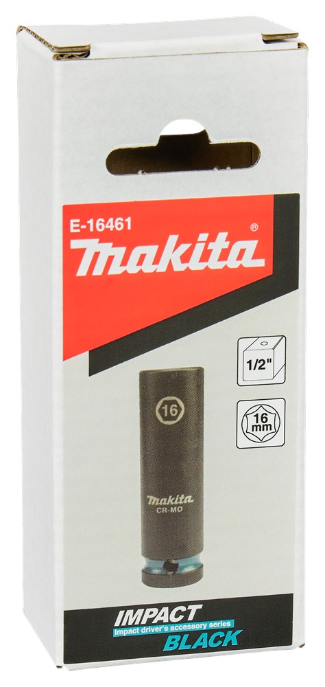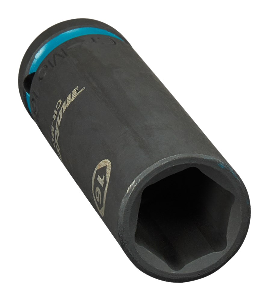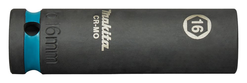 Makita Chroom-Molybdeem krachtdoppen in verschillende diameters en aansluitingen. Losse borgpennen en O-ringen staan in de categorie Borgpennen en O-ringen krachtdoppen. Extra lange Makita 16mm krachtdop uit de Impact Black serie, met 1/2" VK aansluiting met een werklengte van 63mm; perfect voor lastig bereikbare plaatsen. Deze dop is vervaardigd uit Chroom-Molybdeen, heeft een nauwkeurige passing en een lange levensduur. Voorzien van een Makita-teal gekleurde band en maataanduiding. Deze dop wordt geleverd zonder O-ring en borgpin.
