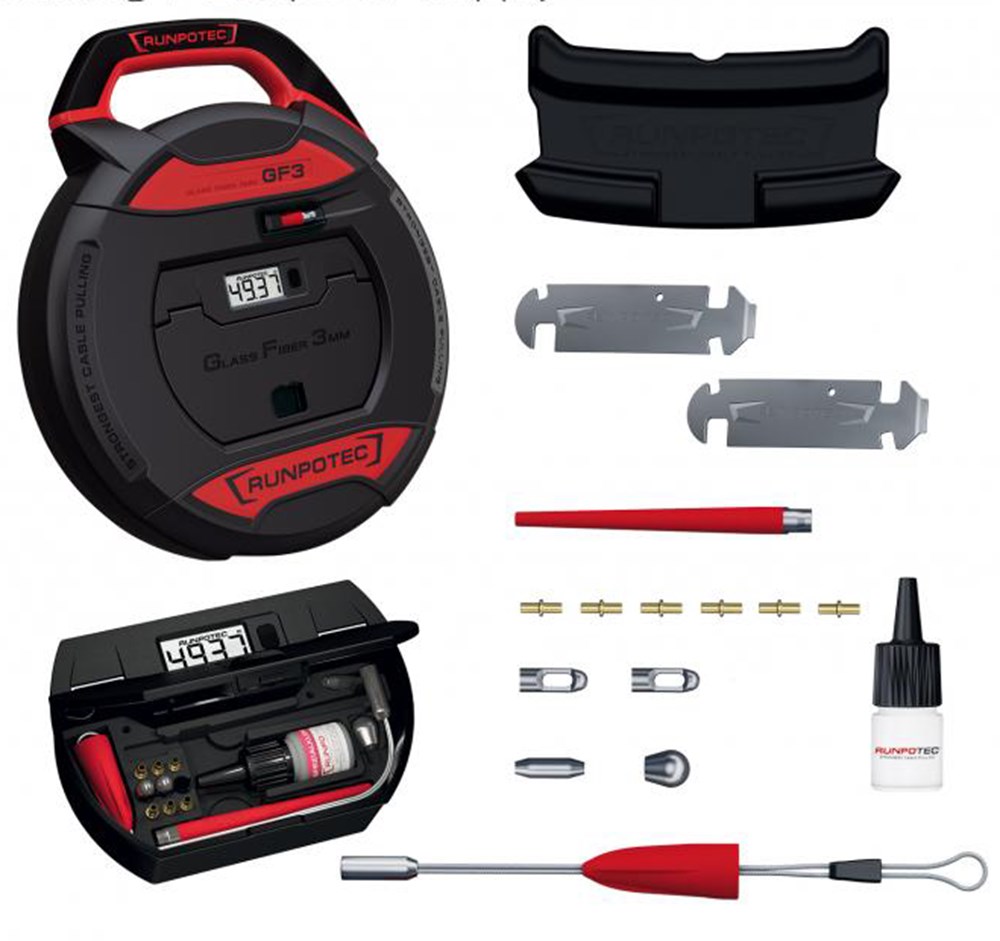 De terugduwbeveiliging voorkomt dat de glasvezeltrekveer per ongeluk terug in de box glijdt. Daarnaast beschikt de box over een ergonomische draaggreep en een antisliplaag. Een 18-delige accessoireset wordt meegeleverd.