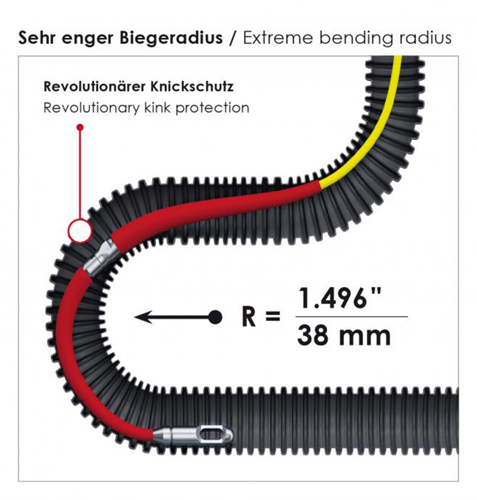 Dankzij de nieuw ontwikkelde knikbeschermingstechnologie kunnen buigradiussen tot R = 38 mm worden overwonnen. De opgegeven totale breekkracht van 130 kg heeft betrekking op de glasvezeltrekveer inclusief anti-knikhulzen. Uitstekend in combinatie met de RUNPOTEC inspectiecamera's.