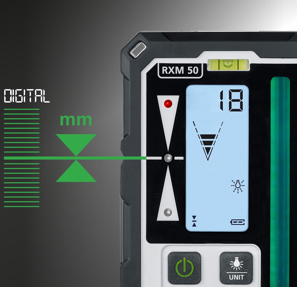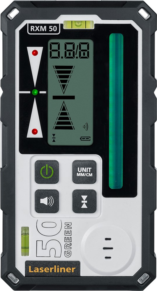 Deze laserontvanger maakt snelle uitlijnwerkzaamheden dichtbij en veraf mogelijk en is geschikt voor alle groene lijnlasers met RX READY-technologie. Hij herkent tijdbesparend de met een hoge frequentie pulserende laserlijnen tot een maximale afstand van 50 meter. Per pijlsymbool en millimeterweergave wordt de gebruiker geïnformeerd over het exacte hoogteverschil van de laserstraal tot het gemarkeerde niveau. Het aflezen van de meetwaarden is dankzij de grote lc-displays op beide zijden van de ontvanger heel eenvoudig en snel mogelijk. Dankzij het display aan de achterkant is het ook mogelijk om tegen de uitlaatopening van de laser in te werken en de meetwaarden af te lezen.