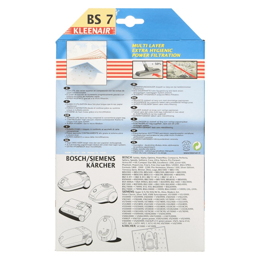 Gaat twee keer langer mee dan een papieren stofzuigerzak. Altijd krachtig zuigvermogen dankzij een uniek meer-lagen-systeem. Extra hygiënisch door microfiltratie. Geschikt voor stofzuigers van Bosch en Siemens type Bosch+Siemens Bs-7-4.