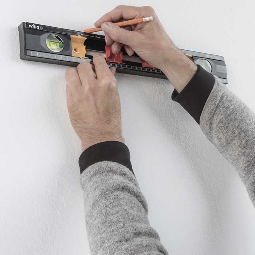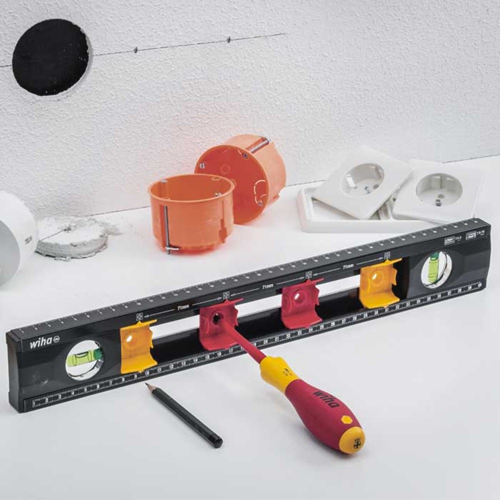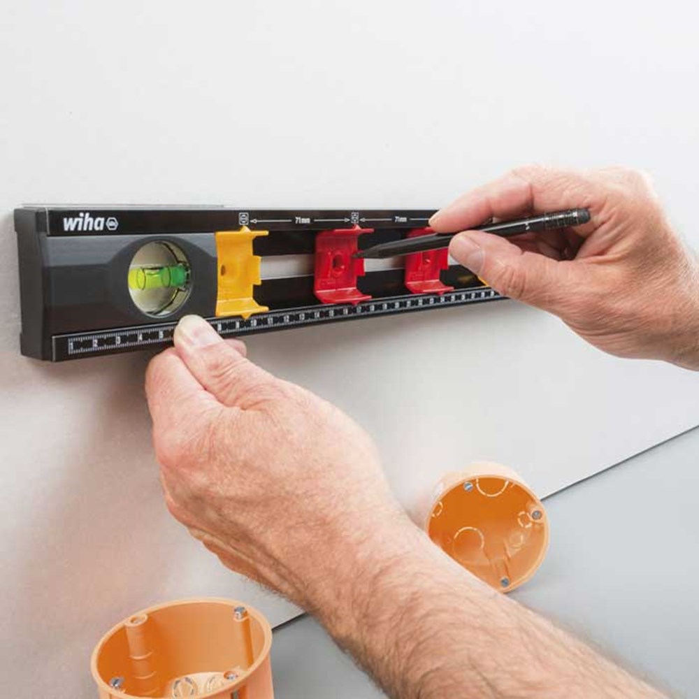 Met de waterpas kan, dankzij de doorlopende kunststof behuizing, lijnen worden afgetekend zonder onderbrekingen. Zelfs in bovenaanzicht kan met de geraffineerd geplaatste schaalverdelingen comfortabel worden bemaat. Nog een voordeel bij de elektrotechnische installatie bieden de variabele afstandsmarkeringen voor maximaal 4 inbouwdozen. Dankzij de verschuifbare markeerpunten voor inbouwdozen kan de waterpas aan de betreffende nationaal voorgeschreven markeringsafstanden worden aangepast en dus ook internationaal worden gebruikt. Dankzij zijn compacte vorm is hij bovendien perfect geschikt voor mobiel gebruik en kan hij gemakkelijk in de Wiha elektricienskoffer worden opgeborgen.