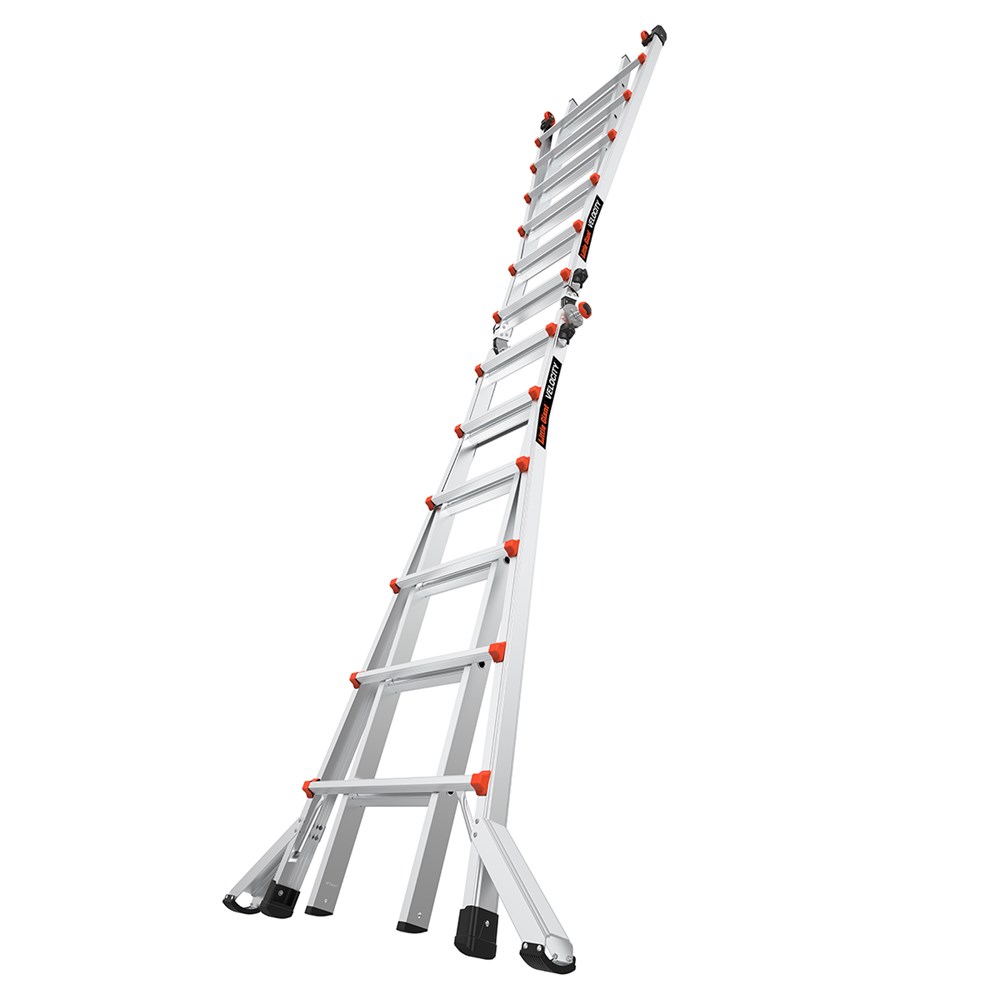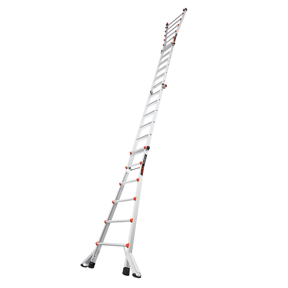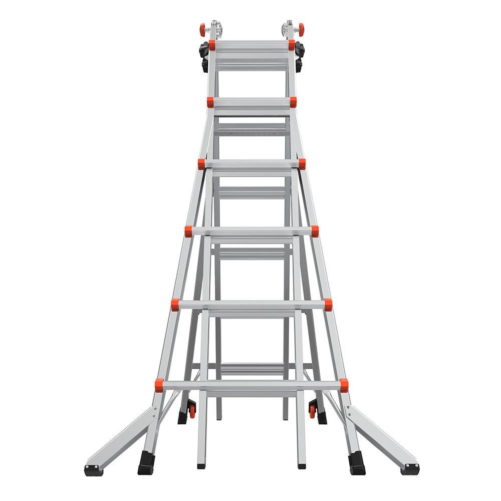 De alles-in-één multifunctionele ladder en trap voor bouw en industrie. Altijd vergrendeld in A-stand met de 4-puntsvergrendeling. Als dubbele trap, als rechte ladder met uitgebogen bomen en als steigerbok met behulp van de werkbrug. Bij ongelijk niveau en makkelijk in transport en opslag.