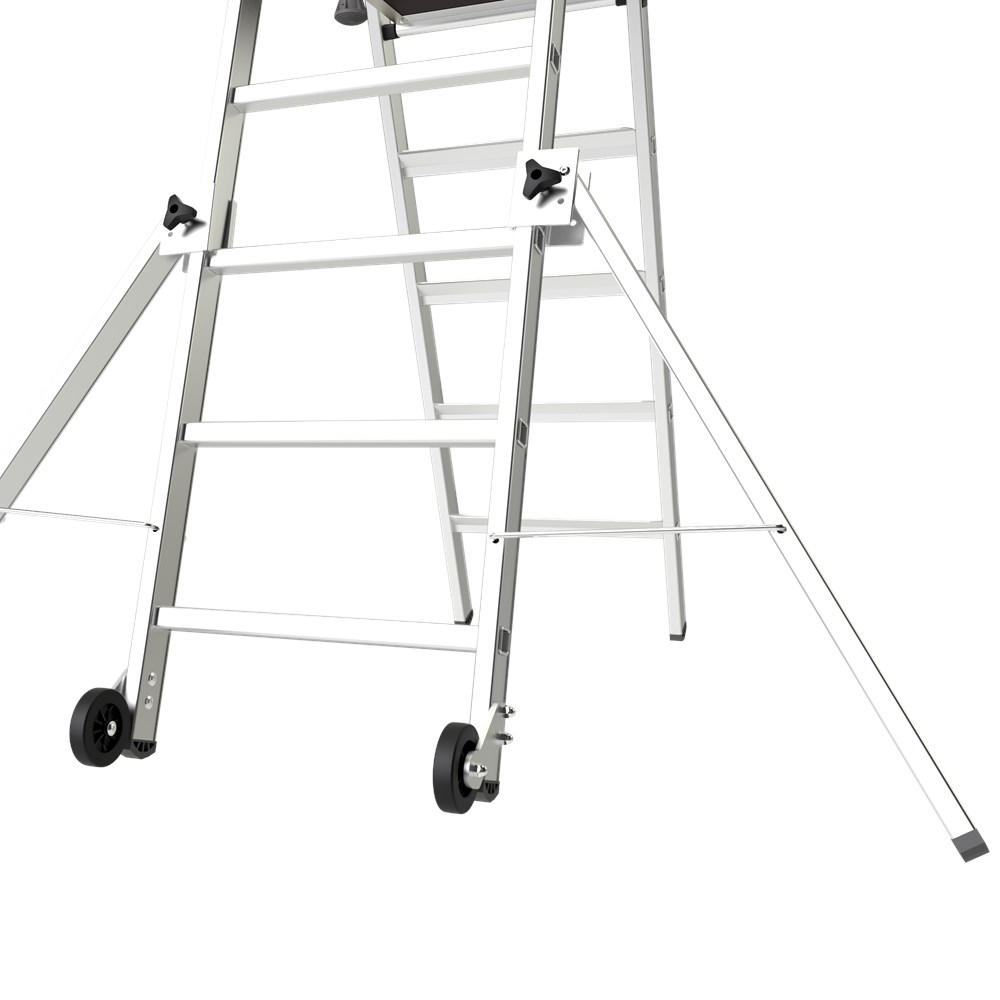 Inklapbare en verrijdbare bordestrap met achterframe dat over kleine obstakels kan worden geplaatst. Voorzien van groot anti-slip platform (500 x 400 mm) met schoprand en leuning rondom. Standaard met 80 mm diepe anti-slip treden, wielen Ø 100 mm en een tooltray voor materialen en gereedschap. Vanaf 5 treden voorzien van in-/uitklapbare stabilisatoren, kleinere modellen met 2 vaste stabilisatoren.