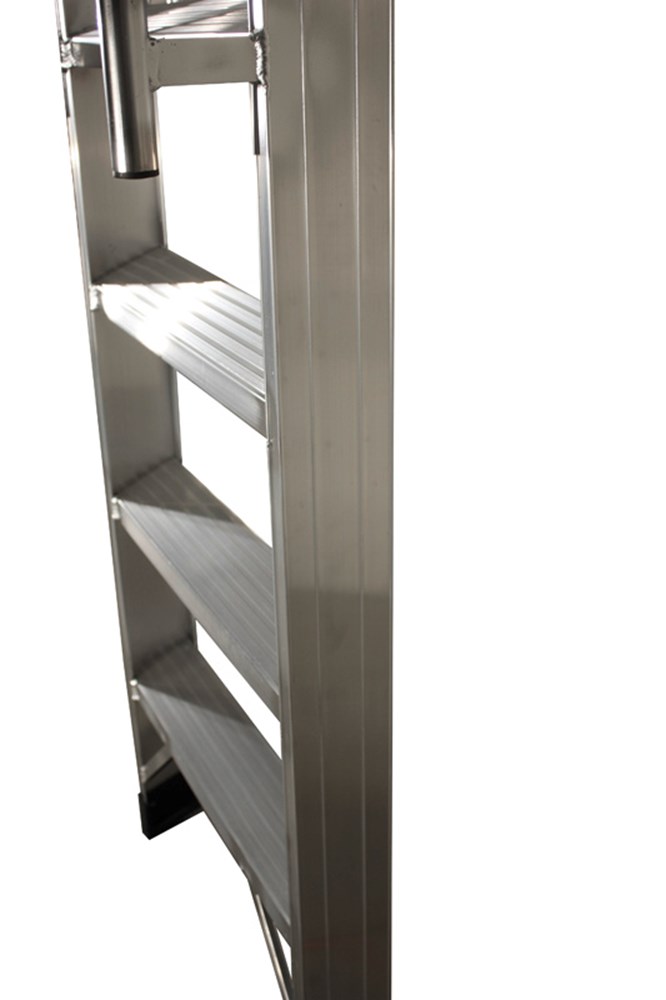 Extra brede magazijntrap met 10 cm diepe anti-slip treden. Standaard voorzien van 1 meter hoge doorloop met aangrijpleuningen aan beide zijden.
