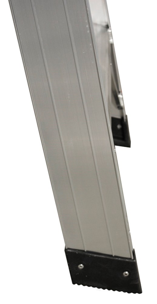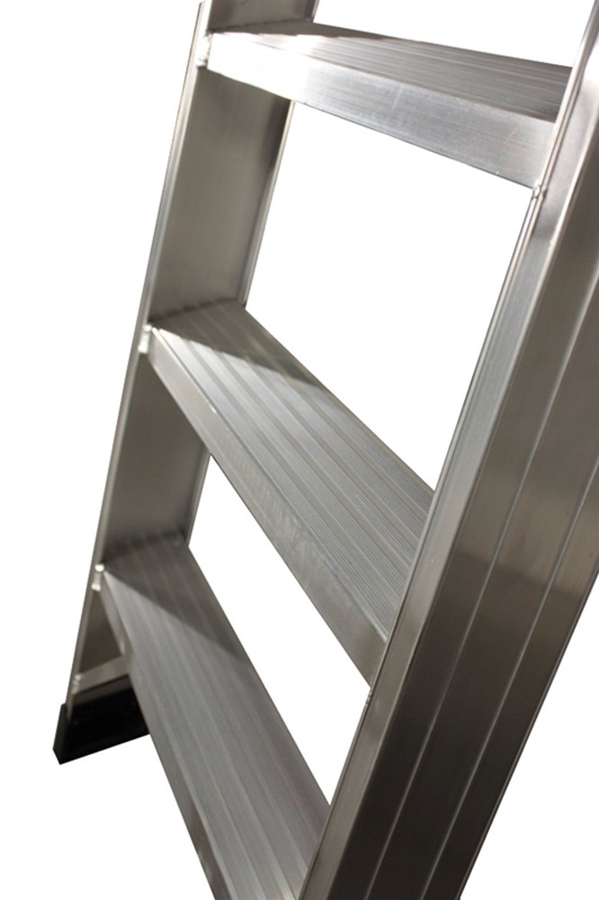 Extra brede magazijntrap met 10 cm diepe anti-slip treden. Standaard voorzien van 1 meter hoge doorloop met aangrijpleuningen aan beide zijden.