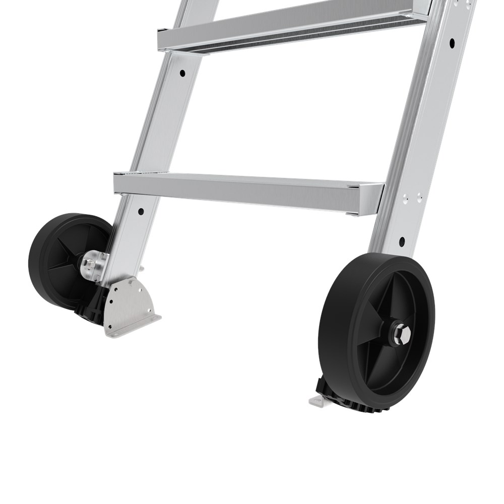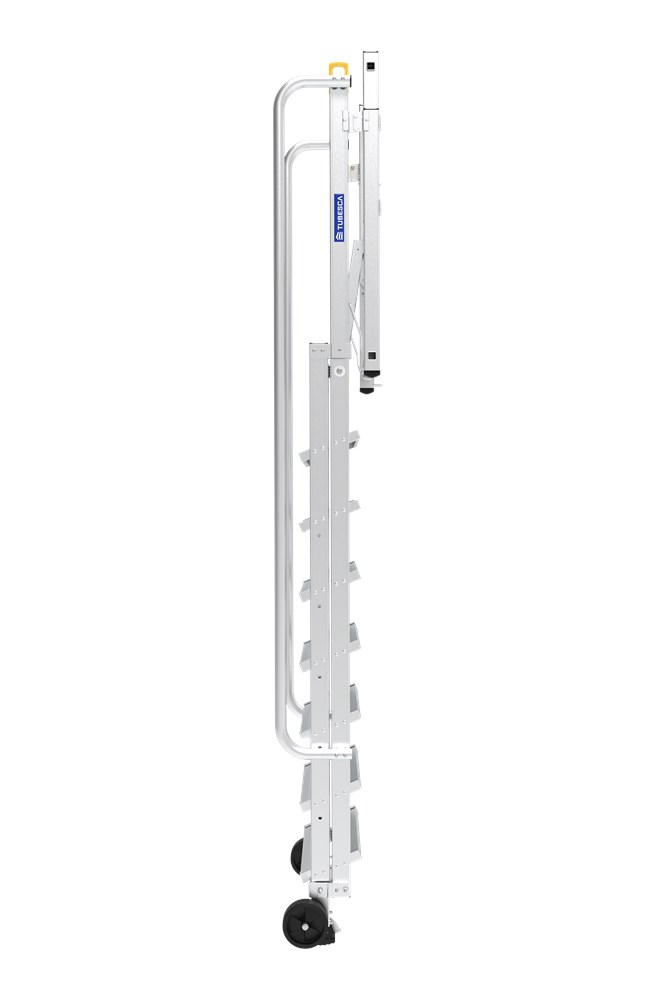 Veilig toegang op locatie tot 4.8 m hoogte! Comfortabele treden van 8 cm diep, aangrijpleuningen en een toegangshek. Uitstapplatform van 500 x 500 mm Voorzien van 2 voetplaten met ogen (excl. bevestigingsmaterialen). In transport slechts 41 cm dik. Telescopisch instelbaar, zeer compact in transport!