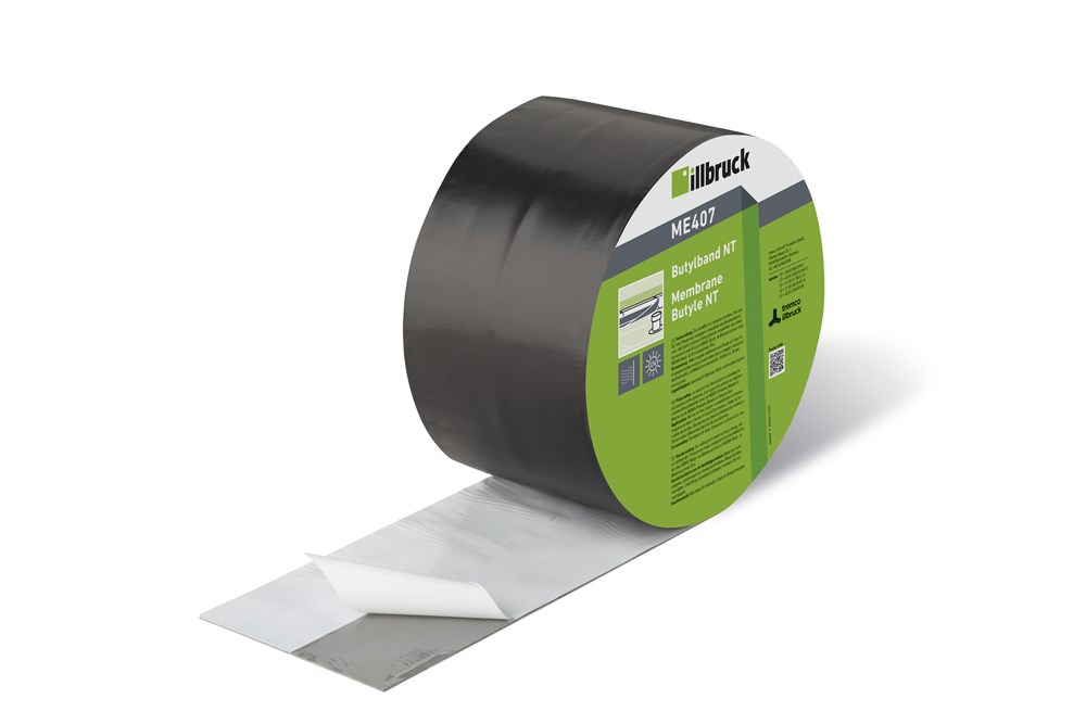 ME407 Butylband NT is een koud zelfklevend membraan voor damp-, lucht-, en waterdichte aansluitingen tussen gevelelementen en draagconstructies. Zowel de drager als de butyl kleeflaag zijn UV-bestendig.