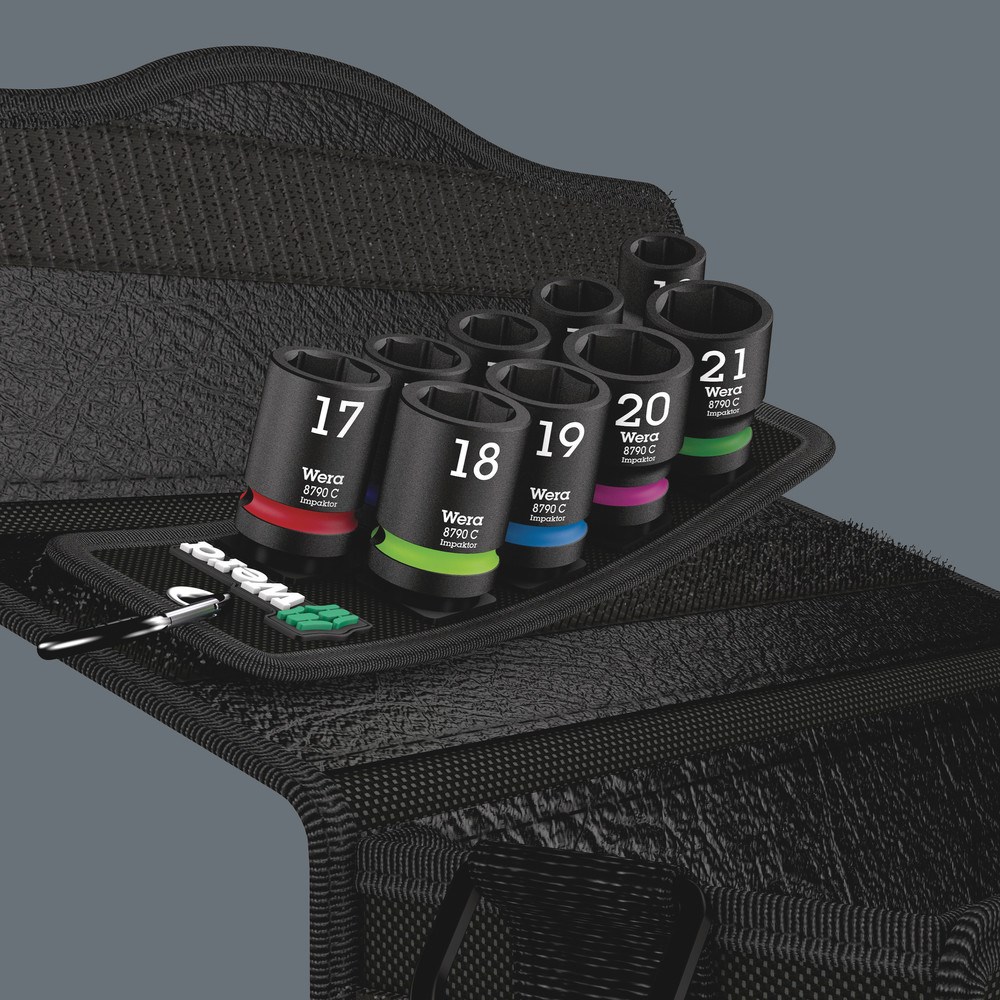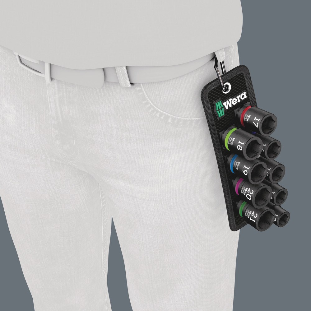 Robuuste stoffen riem (belt) in karakteristiek Wera design met 9 Impaktor-doppen en dit alles uiterst compact. Een soepel werkend draaimechanisme maakt veilig opbergen en makkelijk verwijderen van de doppen mogelijk. Inclusief karabijnhaak voor bevestiging aan broekriemlus of tassen. Achterzijde van vliesstof en klittenbandsegment voor eenvoudige bevestiging aan bijvoorbeeld wanden, rekken, gereedschapswagens en het gereedschapstransportsysteem Wera 2go. Impaktor-doppen voor gebruik in combinatie met elektrisch of perslucht-aangedreven slagschroefmachines met 12,5 mm = 1/2"-aandrijving De Impaktor-technologie zorgt voor een bovengemiddelde gebruiksduur ook onder extreme situaties. Voorzien van 'Take it easy' Toolfinder met kleurcodering op maat - voor het eenvoudig en snel vinden van het benodigde gereedschap. Met zeskantprofiel en dop met boring. Dankzij het zeskantprofiel kunnen hoge krachten worden overgedragen en worden de randen van de schroefmoer resp. schroefkop minder belast als bij een twaalfkantprofiel. Voor buitenzeskant-schroeven en moeren.